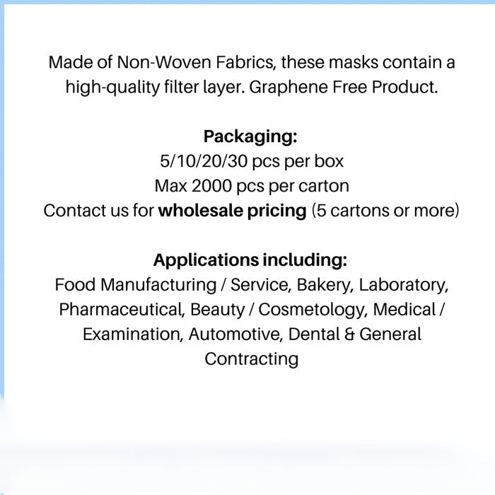 Made of Non-Woven Fabrics, these masks contain a high-quality filter layer. Graphene Free Product.