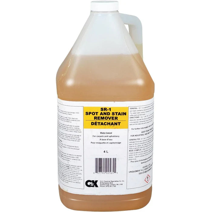 SR-1 is a water-based special blend of cleaning chemicals formulated to give highly satisfactory results on all types of carpet and upholstery fibres. This product removes soil, oils, soluble dyes, food stains, coffee stains and general spots. For certain stains e.g. Tar, Paint, wax, shoe polish, use G.K. Solvent Based Spot and Stain Remover.